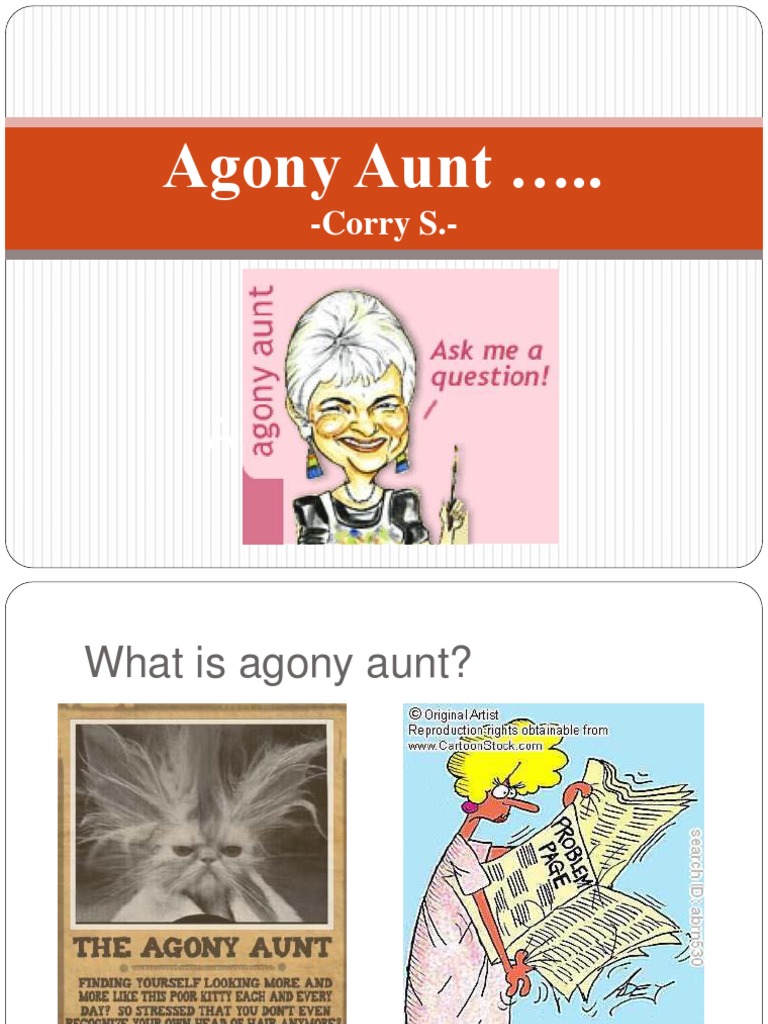 Anonymous agony aunt. Your aunt shouldnt be someone to have sexual feelings for and particularly in your location it could be considered incestuous ie. The responses are written by an advice columnist colloquially known in British English as an agony aunt or agony uncle. Better oil those upper registers of the IV.